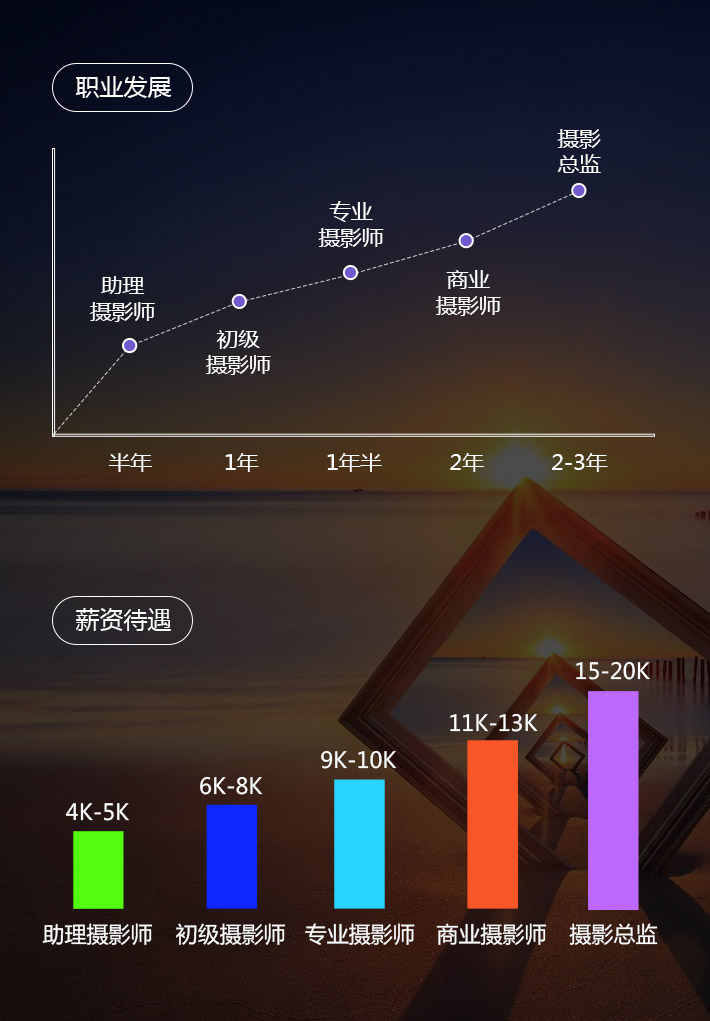 它让你心随手动,记录人生点滴,踏入商业领域,开启一个新的职业方向。就职广告公司、影视公司、版社、影楼等企业单位,也可以同时拥有工作室,成为知名的艺术摄影大师!